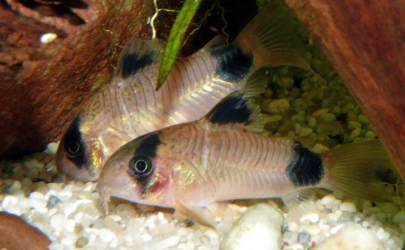 Arrange the tank with open areas for swimming. Driftwood or bogwood, as well as plants, make good hiding places for cories. Extended periods of lower or higher than normal water temperatures are not recommended for this species, so regular maintenance is essential. Corys are sensitive to poor water conditions; avoid all salt, copper, and most medications with all scale-less fish, such as the bandit cory. The use of such products is likely to cause more harm than the disease being treated.